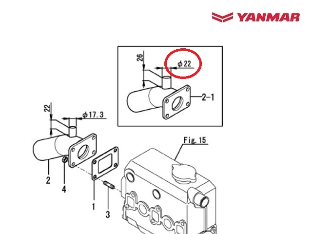 Genuine Yanmar 2YM15, 3YM20, and 3YM30 exhaust elbow. This exhaust has a 22 mm outside diameter water feed spigot.